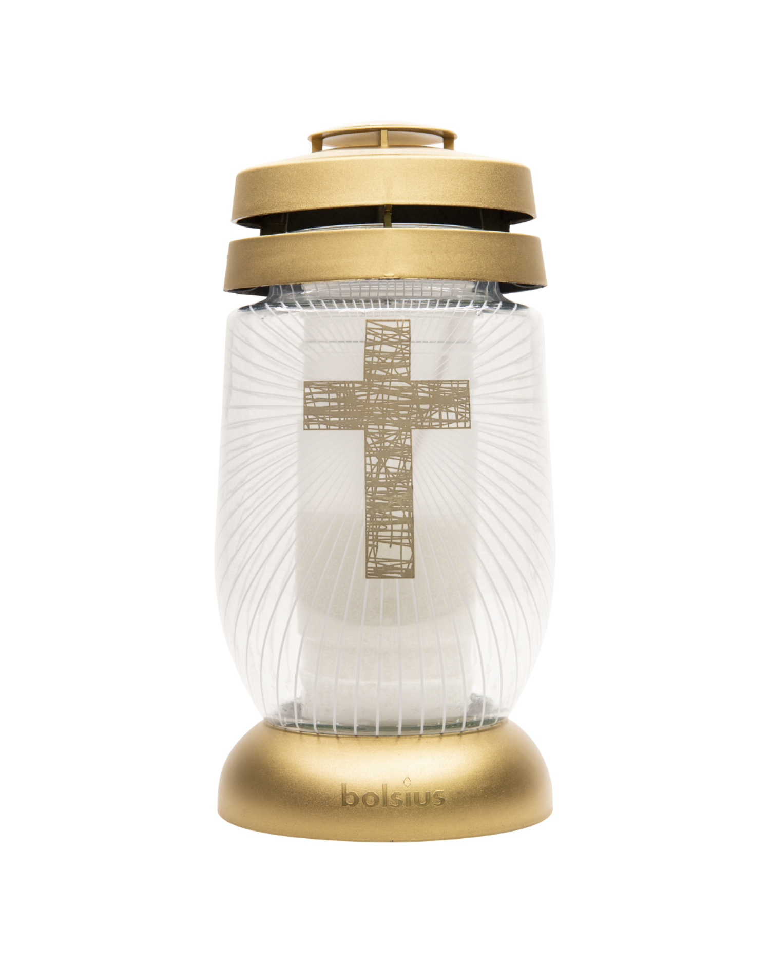 A Bolsius kereszttel díszített üveg mécsese méltó módon fejezi ki a tiszteletet és az emlékezést. A dekoratív keresztmotívum különleges megjelenést kölcsönöz, míg a tartós üveg védi a lángot a szél és eső ellen. Kb. 36 órán át ég, így ideális rövidebb megemlékezésekhez is.